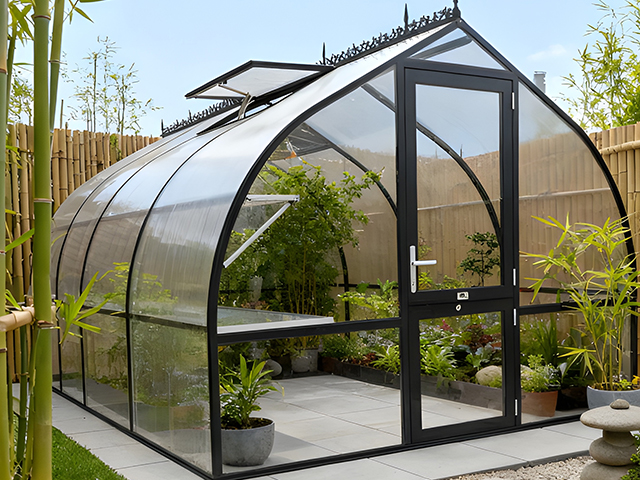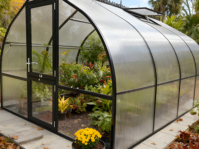 The Riga Black greenhouse from Germany blends the best of both worlds, a crystal-clear front for light and visibility paired with the strength and insulation of twin-wall polycarbonate. Finished in a sleek black frame with elegant roof cresting, it brings refined European style to a structure designed to perform beautifully in every season.