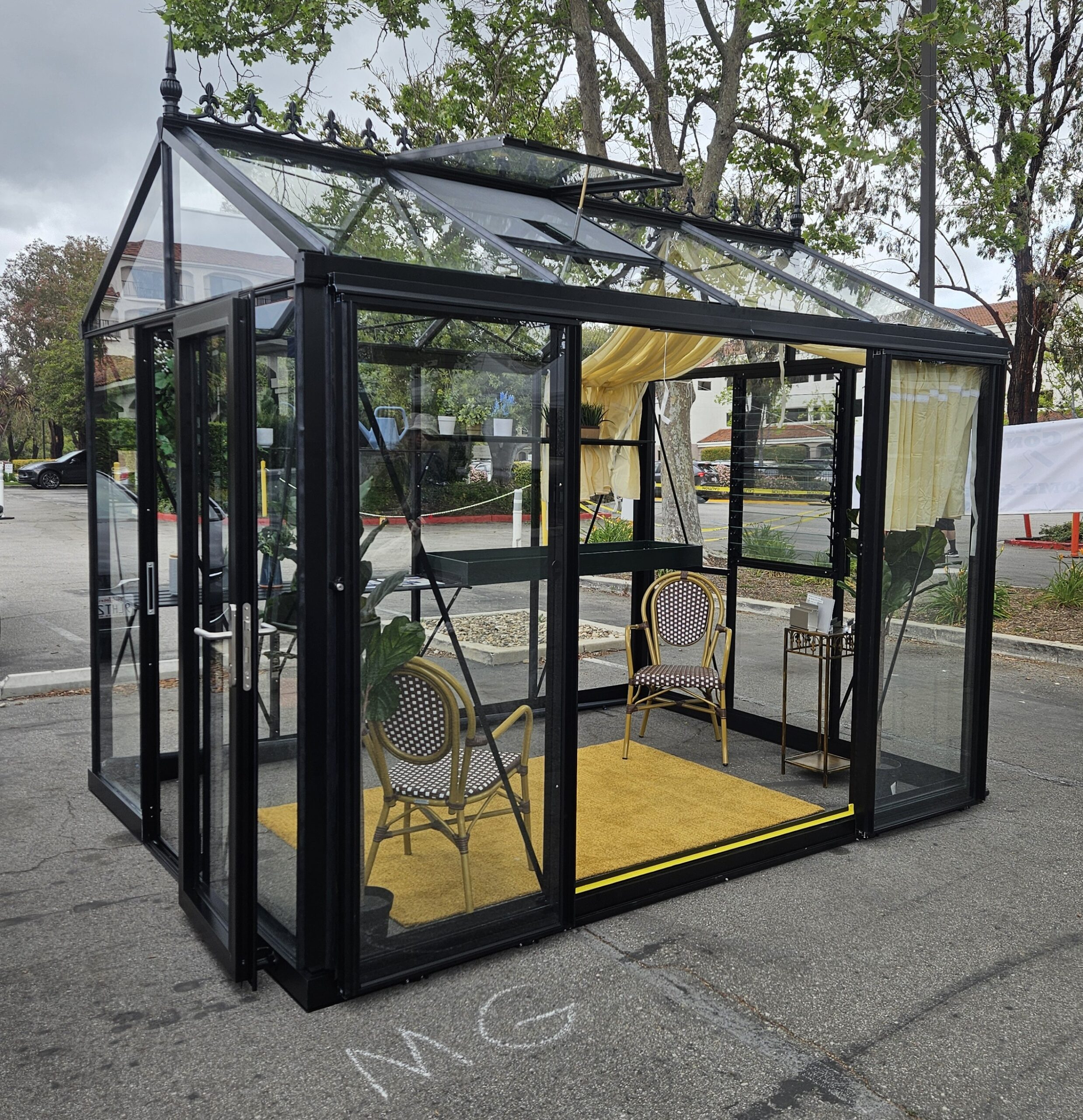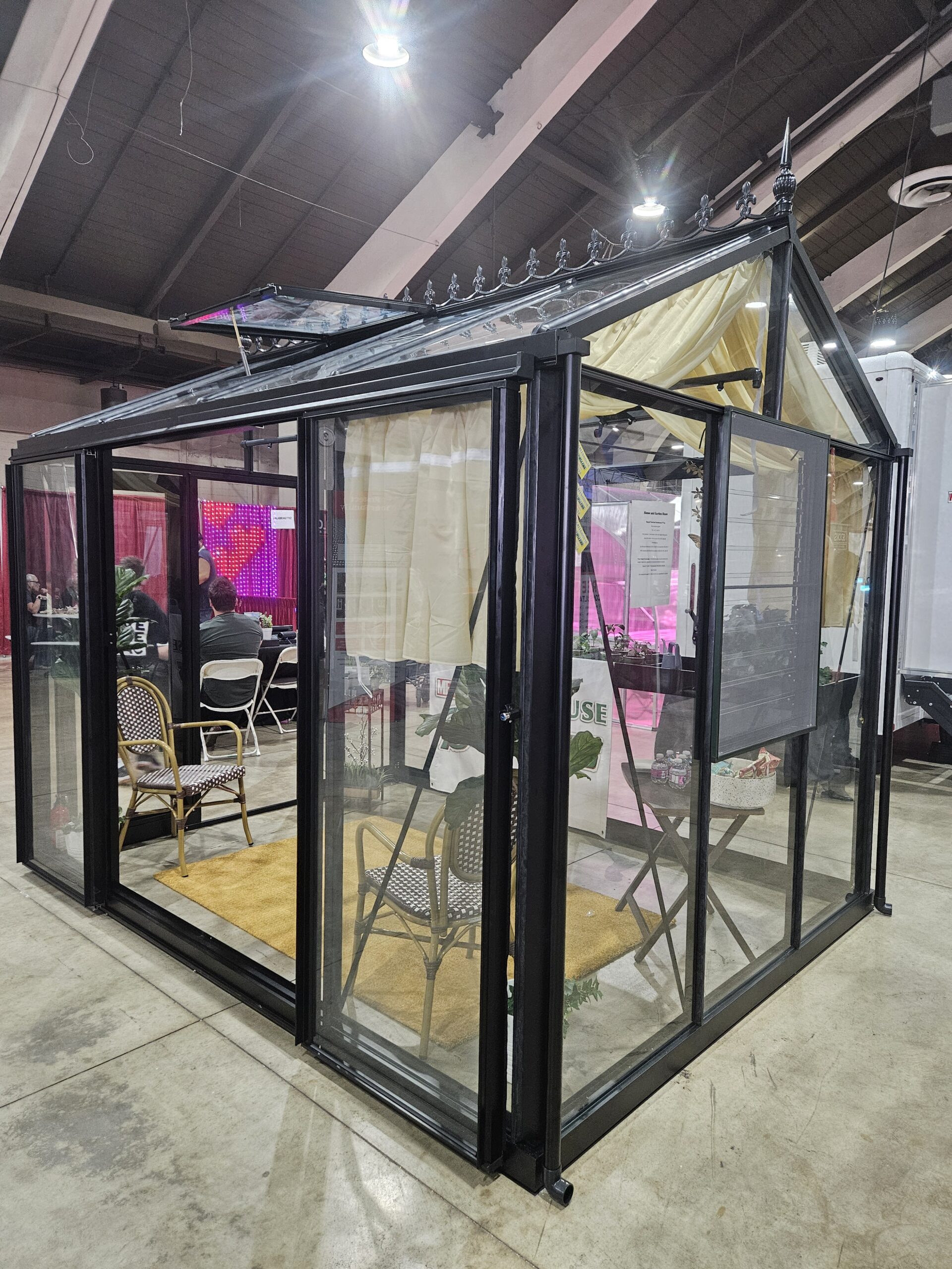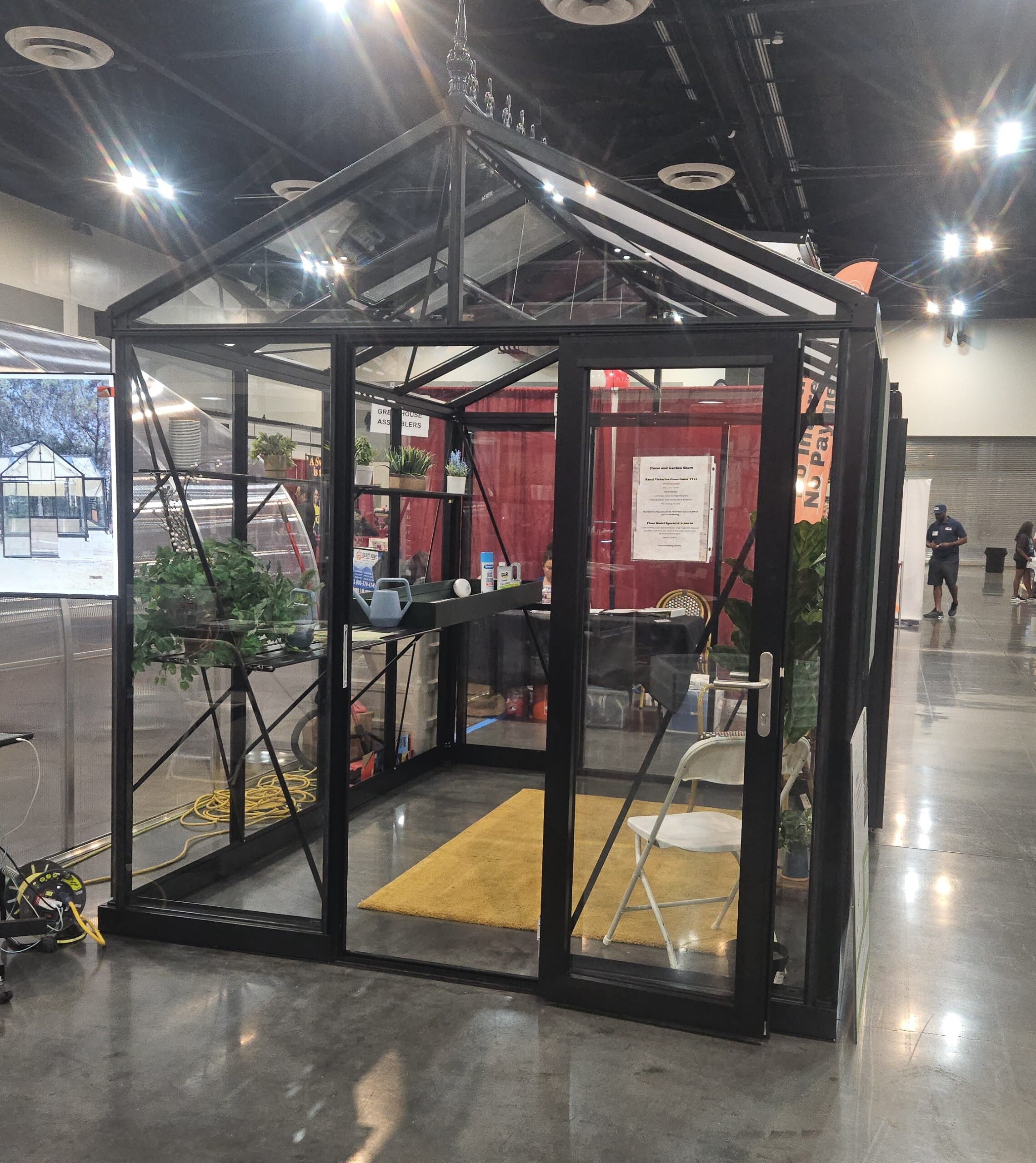 Includes: 2 roof windows (1 automatic opener & spindle opener). 1 louver window with clear lexan cover sheet for the winter season, one single sliding door – can be put in any vertical glass location (front, back or sides), large bottom frame, large gutters with downspouts, roof finials and misting system(customer has to provide a hose to connect to faucet) .