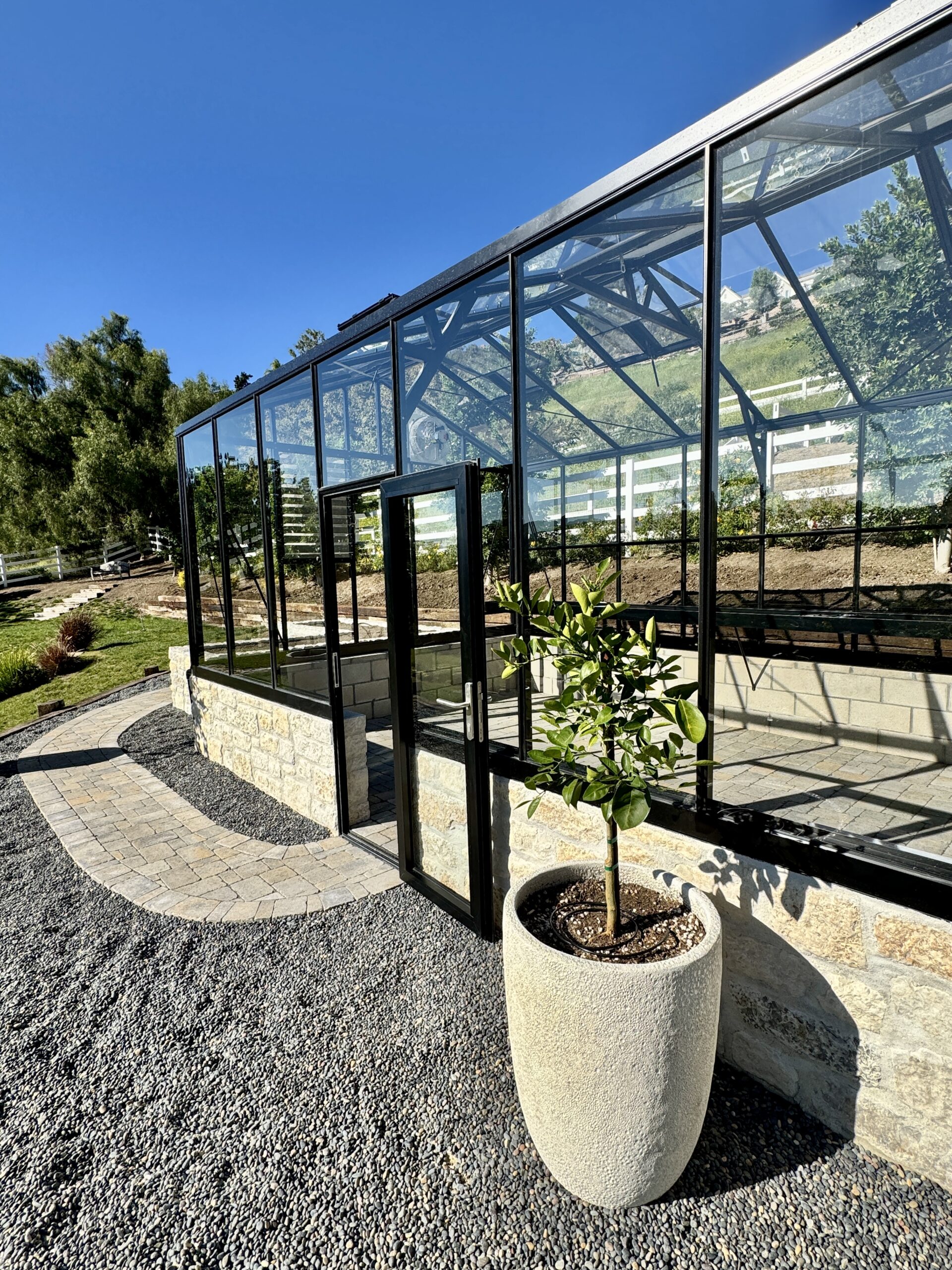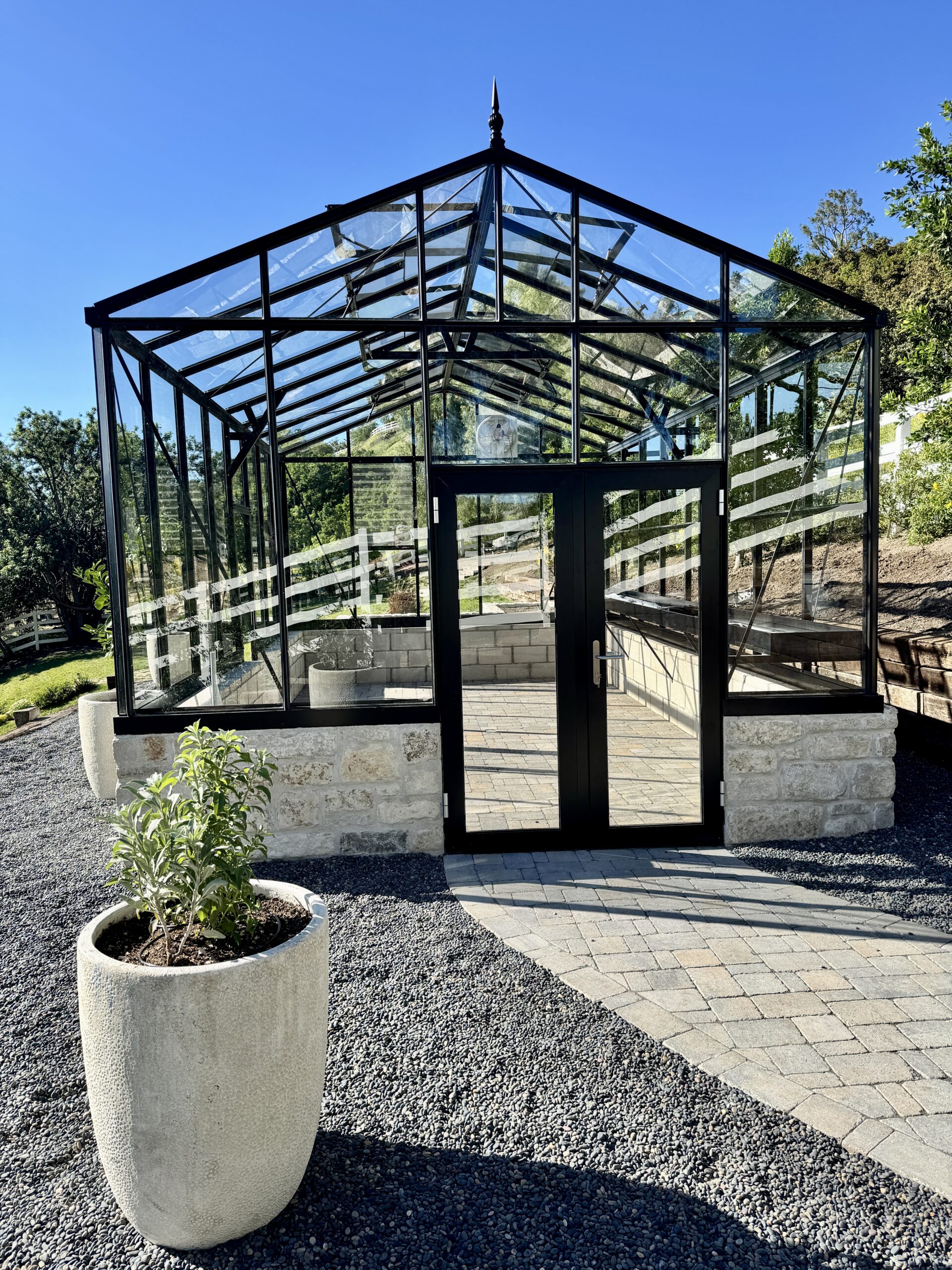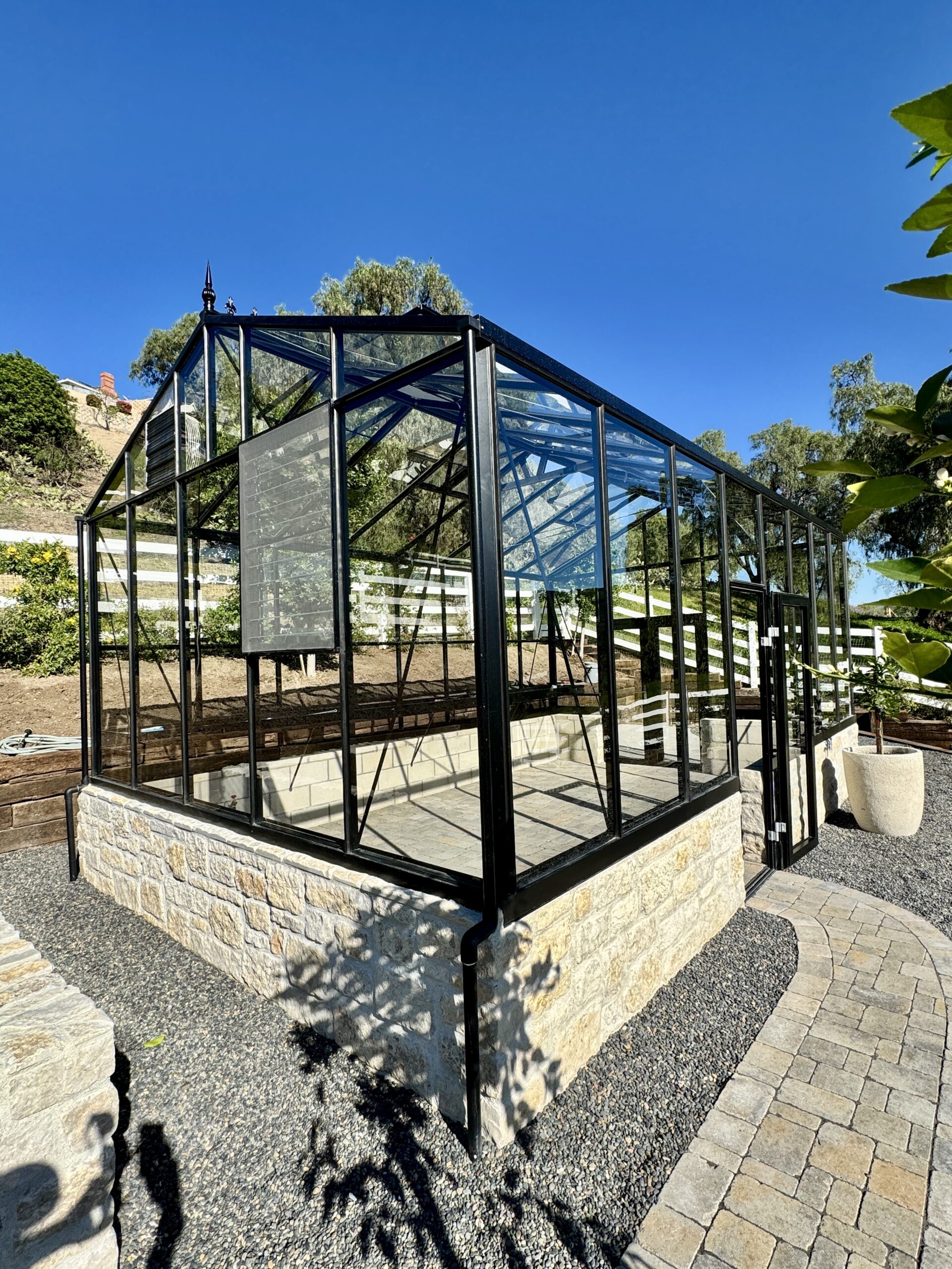 Shoulder (with large gutter) 6’7″ high – about 1 foot higher than other greenhouses